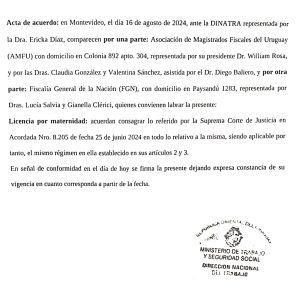 El día de hoy llegamos a un acuerdo entre AMFU-FGN en el MTSS para consagrar la EXTENSIÓN DE LA LICENCIA MATERNAL tomando como referencia lo dispuesto por la SCJ en la ACORDADA 8205/2024. Este punto era una de las cuatro reivindicaciones que AMFU propuso a FGN acordar en un CONVENIO. No se aceptó por parte de la FGN la consagración de un régimen de MEDIO HORARIO PARA LACTANCIA DE 4HS, punto que continuaremos reivindicando en otros ámbitos.